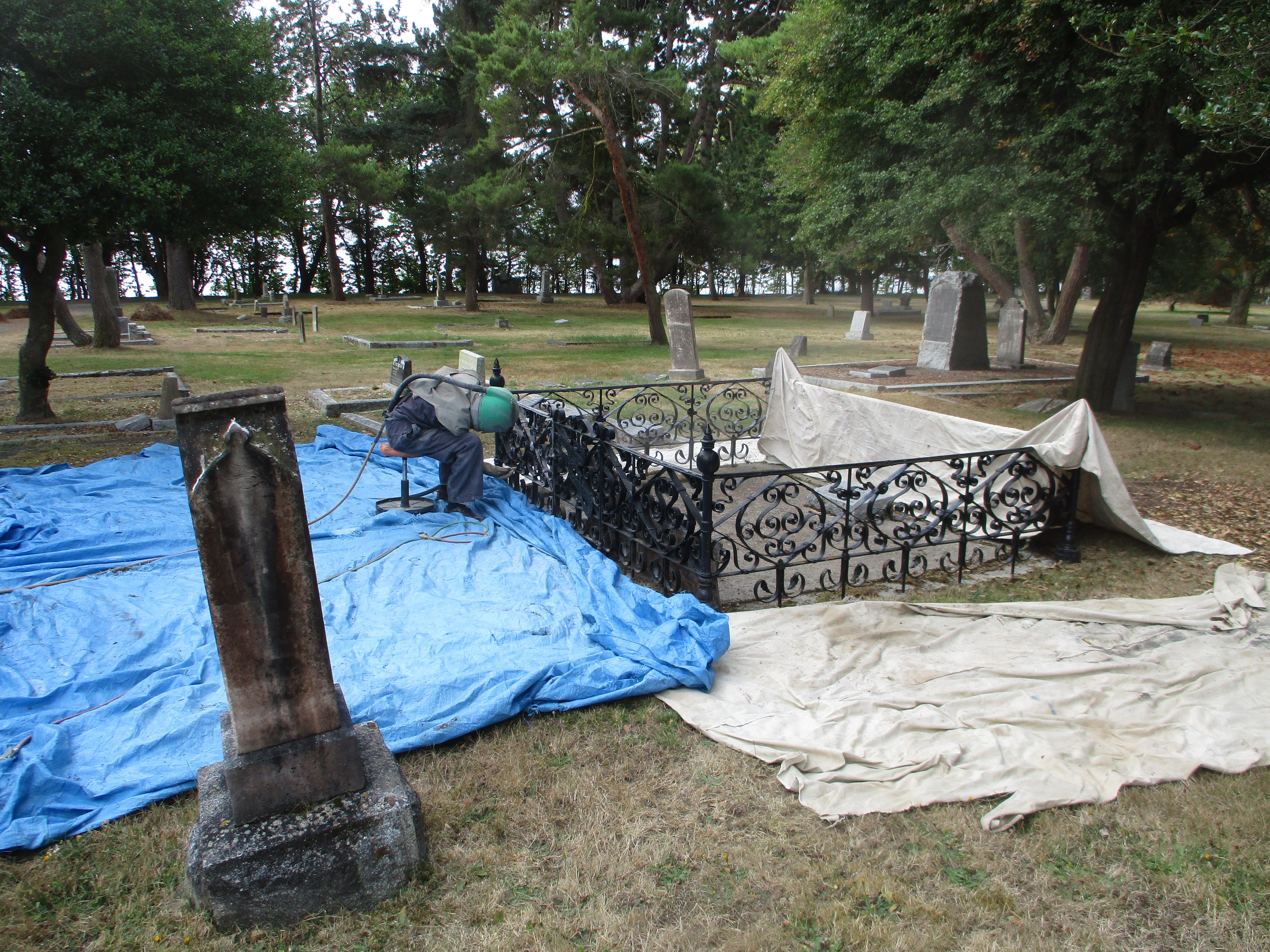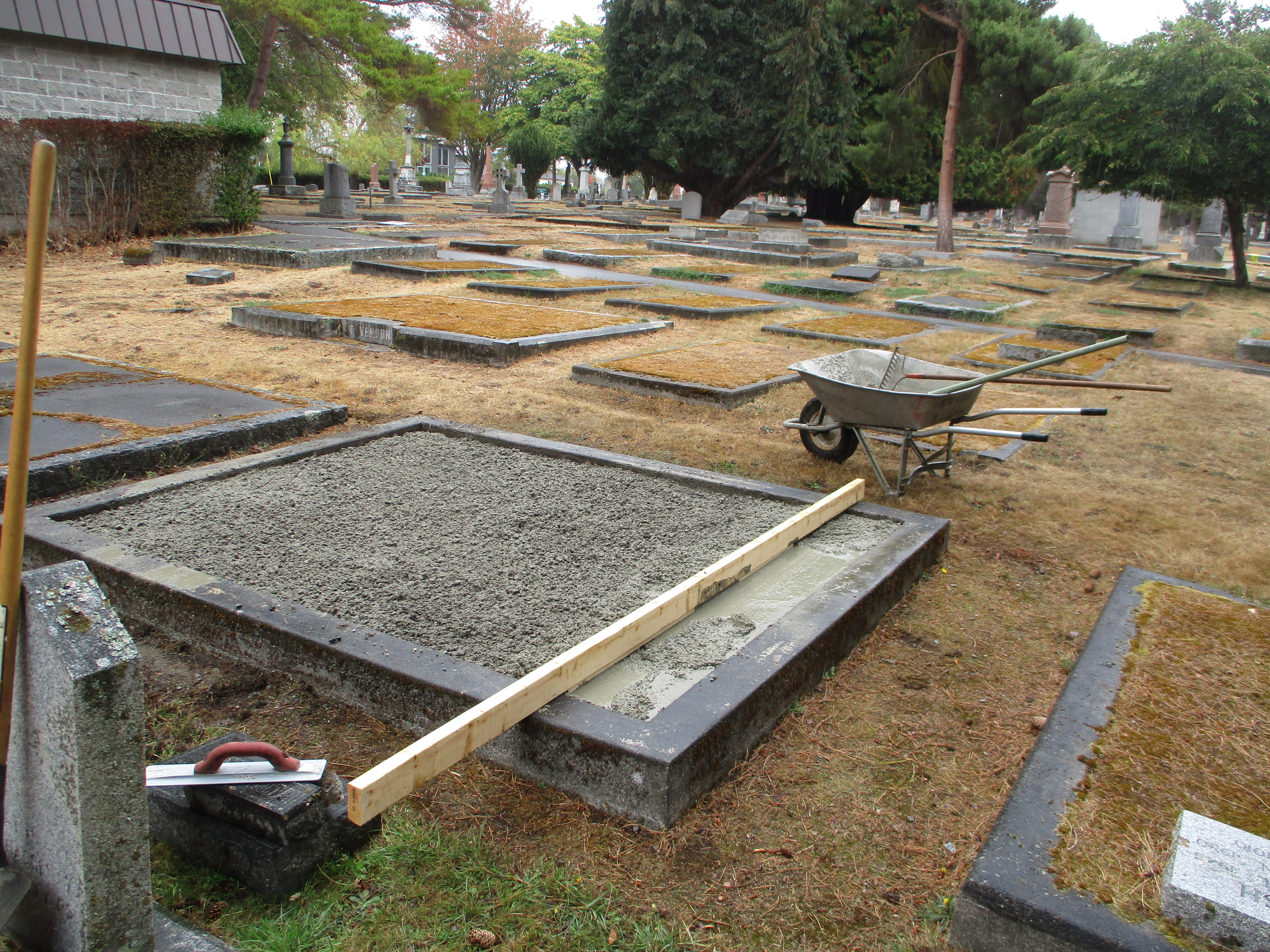 The job of cleaning the old tiles (at 5 minutes each) is now complete and a new concrete top will be poured shortly to form a new base for the tiles. If all goes well, we should lay the tiles by the end of September. This is an exciting project for us and will fulfill Anita Bossi’s wish to return these tiles to Ross Bay Cemetery.
