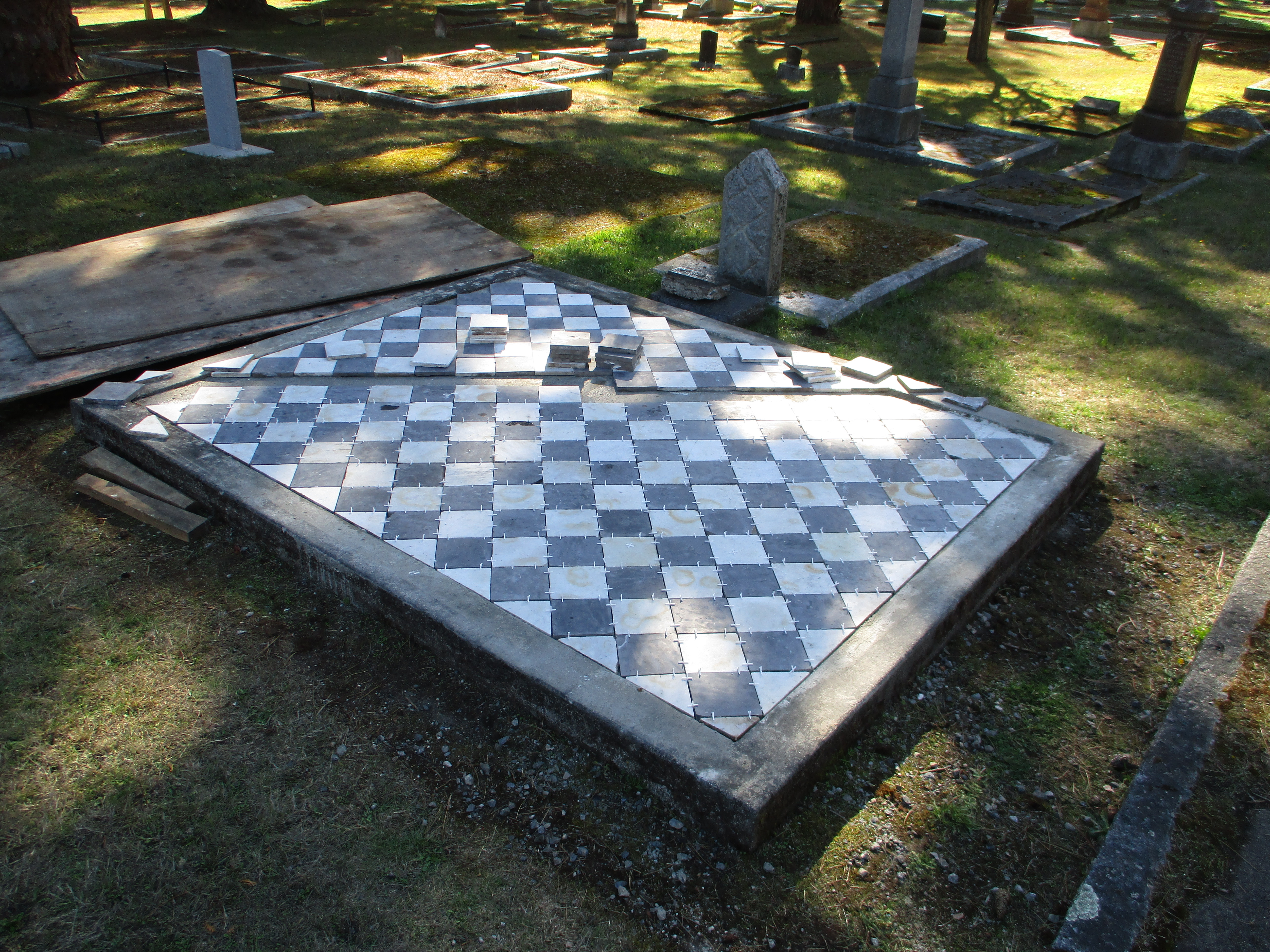 In January we received correspondence from a couple in Shawnigan Lake stating that they were in possession of tiles that were originally from a grave in Ross Bay Cemetery. It turns out that the tiles were given to them by Ms. Anita Bossi when she moved from her house on Quadra Street around 1998. Her hope was that they would find their way back to Ross Bay.
