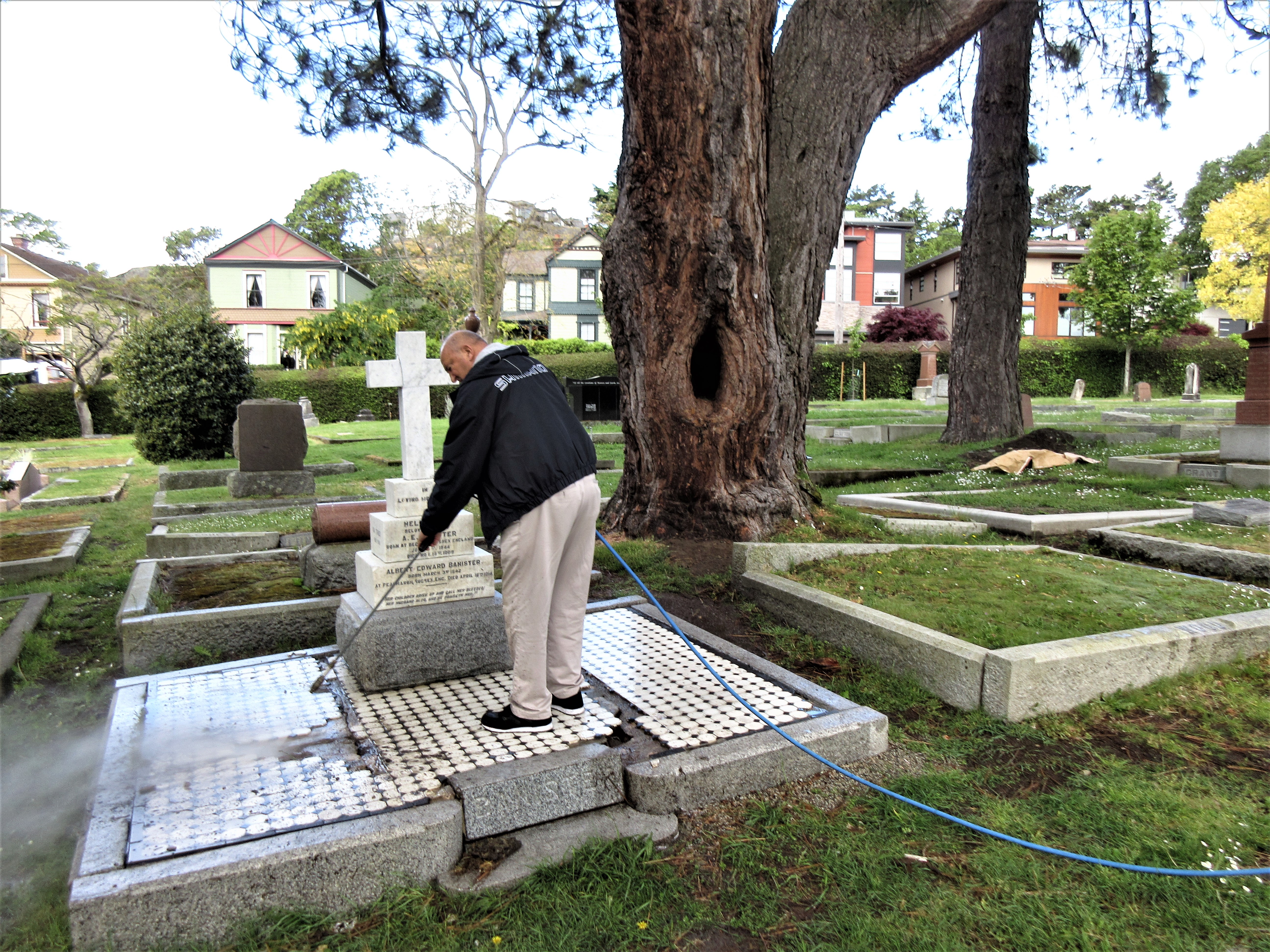 First, we removed the accumulated pitch, removed all loose tiles, cleaned the all the removed tiles and power washed the surface. The surface was then filled and leveled to insure a good surface for the re-installation of the tiles. The cracks and voids between the curbing and the grave top were also filled with cement to prevent new grass from growing. Our stored inventory was searched to find as many matching tiles as possible.