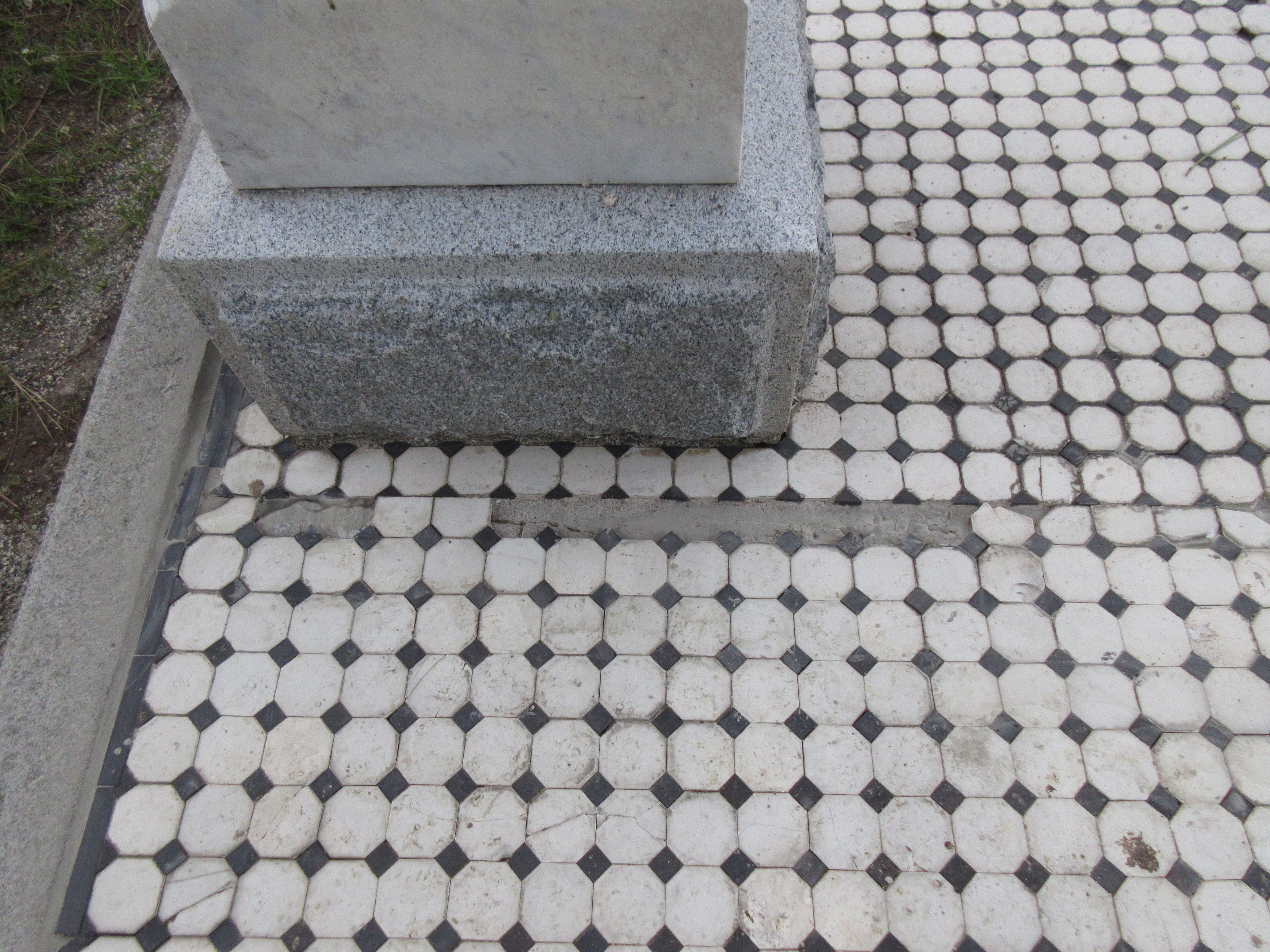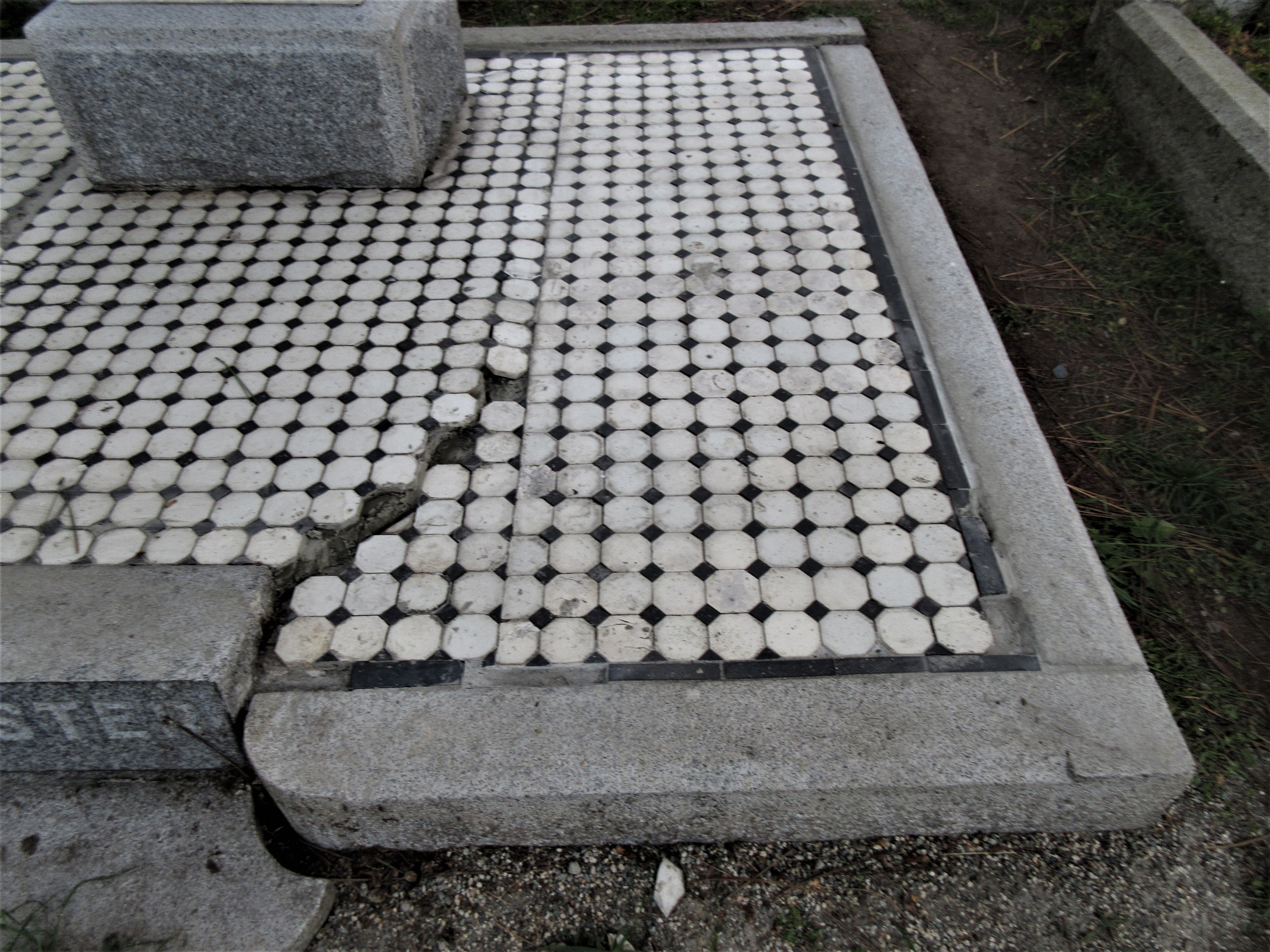 This grave with unique hexagon ceramic tiles was covered in pitch from the overhanging pine tree. The tree has caused the curbing and tiled top to shift and crack. The curb shifting had allowed grass to grow up on the perimeter and the cracking of the top damaged some tiles and loosened others. Some tiles were missing completely, in particular the small 1 inch by 1 inch black accent tiles.
