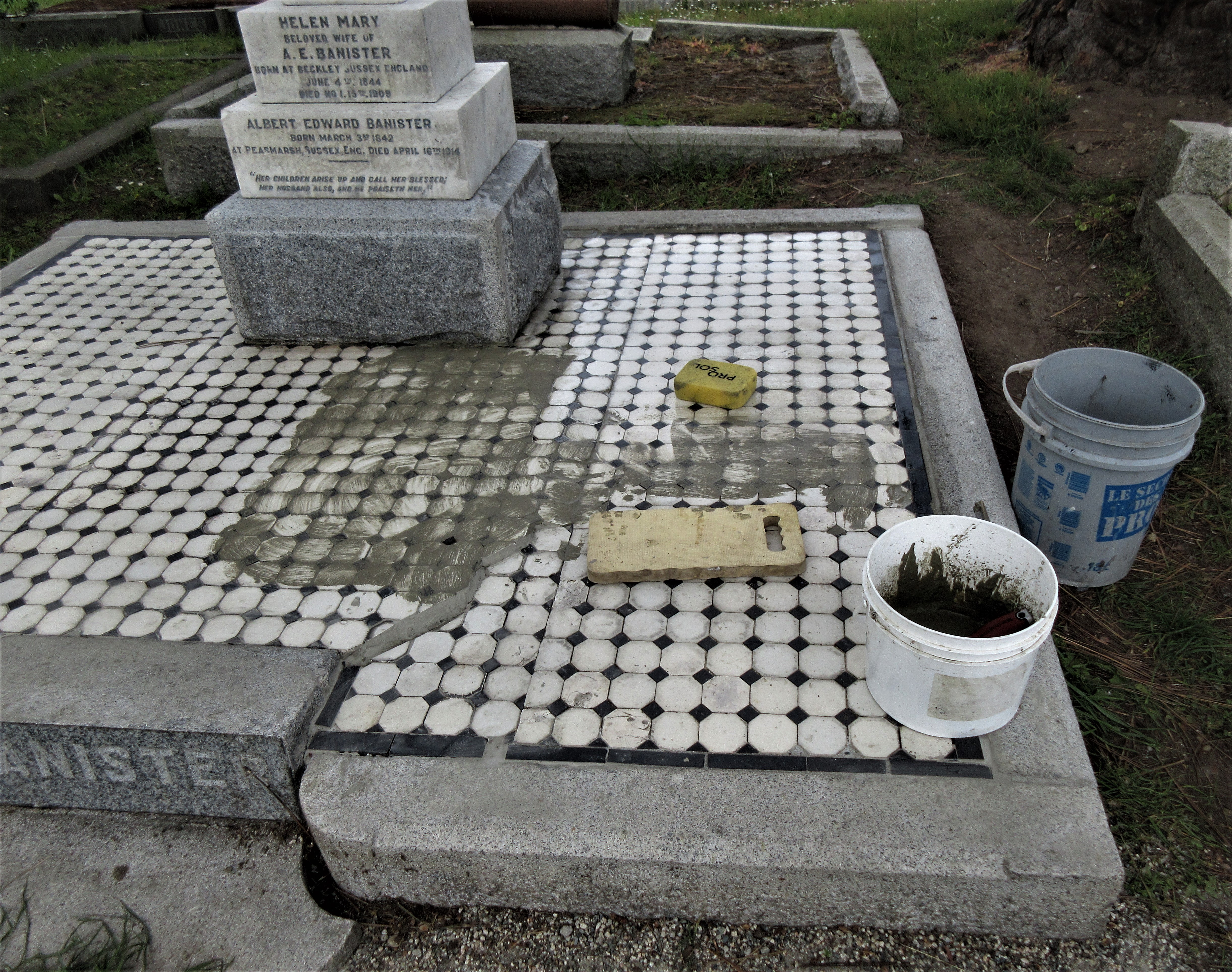 The tiles were then re-installed. New tiles were cut as needed to replace missing ones. Once dry, the whole plot was grouted and sealed.