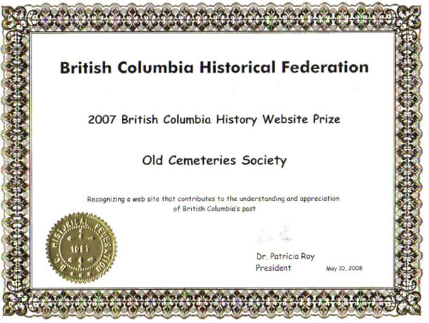 The Old Cemeteries Society was presented with the 2007 prize by BC Historical Federation president Ron Greene at the annual conference on May 10, 2008. The $250 prize and certificate recognizes a website that contributes to the understanding and appreciation of BC’s past.