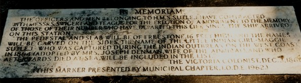 HMS Sutlej Memorial – Sutlej was at Esquimalt during 1863-67. This naval monument is the only one still standing in the Old Burying Grounds. The following item appeared in the Victoria Colonist dated 3 Dec 1866: “The officers and men belonging to HMS Sutlej have contracted with Messrs. Swigert and Teague for the erection of a monument to the memory of those of their number who have departed this life since the ship arrived on this station. The pedestal will be of freestone, 16 feet high, and the names will be carved on the sides. The name of the little Indian girl, Maggie Sutlej, who was captured during the Indian outbreak on the West Coast in 1864 (adopted by Mrs. Joseph Denman, wife of the Admiral) and who afterwards died at sea, will be included in the list - Originally there were a number of names engraved on panels surrounding the monument but these have all flaked away. Edgar Fawcett recorded these names in 1908: George Lush, John Guff, Edward Tiller, Joseph Neckless, Thomas Depnall, John Reese, George Crute, William Douglas, Albert Gilbert and Alexander Borthwick. He didn’t mention Maggie. A writer to the Colonist in 1884 wrote that the Sutlej monument “… chronicles the drowning of four, five buried elsewhere and six buried here”. In 1962 the Municipal Chapter of the Imperial Order Daughters of the Empire (I.O.D.E.) commissioned a white marble tablet, which still lies at the foot of the monument, clearly reiterating the words of the Colonist news item of 1866.