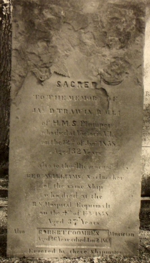 Plumper, a survey vessel, was in our waters between 1857 and 1861. The ship’s company erected a five foot tall, pink sandstone marker with the following inscription: “Sacred to the memory of Jas. D. Trawin, R.M.L.I. of HMS Plumper who died at Victoria, V.I. on the 12th of Jan. 1858, aged 32 years – Also to the memory of George Williams, Sailmaker, of the same ship who died at Royal Naval Hospital Esquimalt on the 4th of Feb. 1858 – Also Robert Coombes, Musician, aged 26 years, died Jan. 2, 1861 – Erected by their shipmates”. The remains of this marker are stored at Beacon Hill Park, Victoria