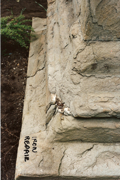 Sandstones are cemented together with carbonate cements or silica cements, most commonly. Clay-based, or argillaceous cements and iron cements also are responsible for bonding the grains of sandstone together. The calcareous carbonate cements that are most common in sandstone are relatively soft, of medium density, and soluble in acid. Silaceous cements are contrasting in qualities of hardness: they are dense, durable, and not readily soluble in acids. Iron cement has varying durability and is prone to rusting with subsequent staining of the material and any other materials in a run¬off position. Argillaceous, clay-based cements are not very durable, soft, and subject to swelling in moisture (Bell and Wright 1985.)