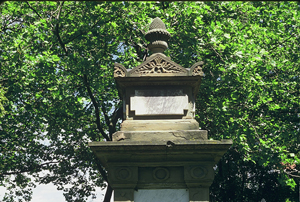 The base of the monument consists of twelve sandstone blocks sited on the rubble and concrete foundation. The blocks support the monument which is constructed in the form of a miniature building. Four corner pillars are infilled with large white marble insets, surmounted by a lintel, pediment and smaller pedimented cube. This smaller cube is probably formed from a solid piece of sandstone, and has one white marble plaque affixed to each face. The pediment surrounds a quarter gable roof surmounted by a sandstone pineapple ornament. The sandstone corner pillars have been set with vertical bedding planes, and consequently are much deteriorated. The marble insets on the lower section of the monument are held in place with iron cramp irons. These have rusted and expanded, breaking the marble in the upper corners of each of the four insets. The upper marble plaques show rust-colored staining but no visible iron attachments, and structurally they appear to be stable.