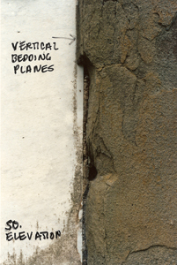 As mentioned above, the construction of the monument utilizing sandstone laid with vertical bedding planes, as in the corner pillars, is contributing to the monument deterioration. The vertical planes allow for easy and rapid penetration of water deep into the stone structure, where mineral dissolution occurs. As the water evaporates from deep within the stone, it brings to the surface solubilized minerals which are redeposited at or just below the surface. These minerals build up to form a surface layer with different chemical and mechanical properties than the surface immediately below. Often this surface layer is harder than the interior of the stone, and has more densely packed minerals, such as iron oxides, which have been redeposited there. Eventually this surface layer spalls off, revealing the weakened stone interior which is easily eroded by rain and wind. This type of erosion is in evidence all over the base of the monument. A further consequence of moisture trapped within the stone is that during freeze-thaw cycles water will crystallize into ice, breaking apart the pore structure just as soluble salts do.