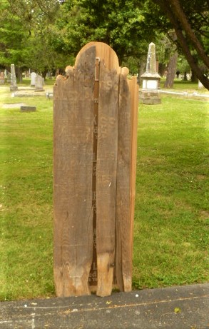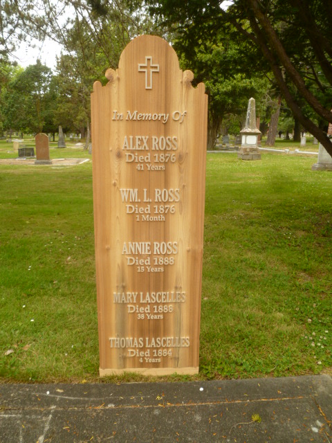 For the less wealthy, the usual form of marker was a simple stone tablet or a wooden headboard. There were many wooden markers around Ross Bay Cemetery in the early days, but wood decays, and the last surviving wooden marker was replaced in 1983 with a stone one. Below is the original and a replica that we have made.