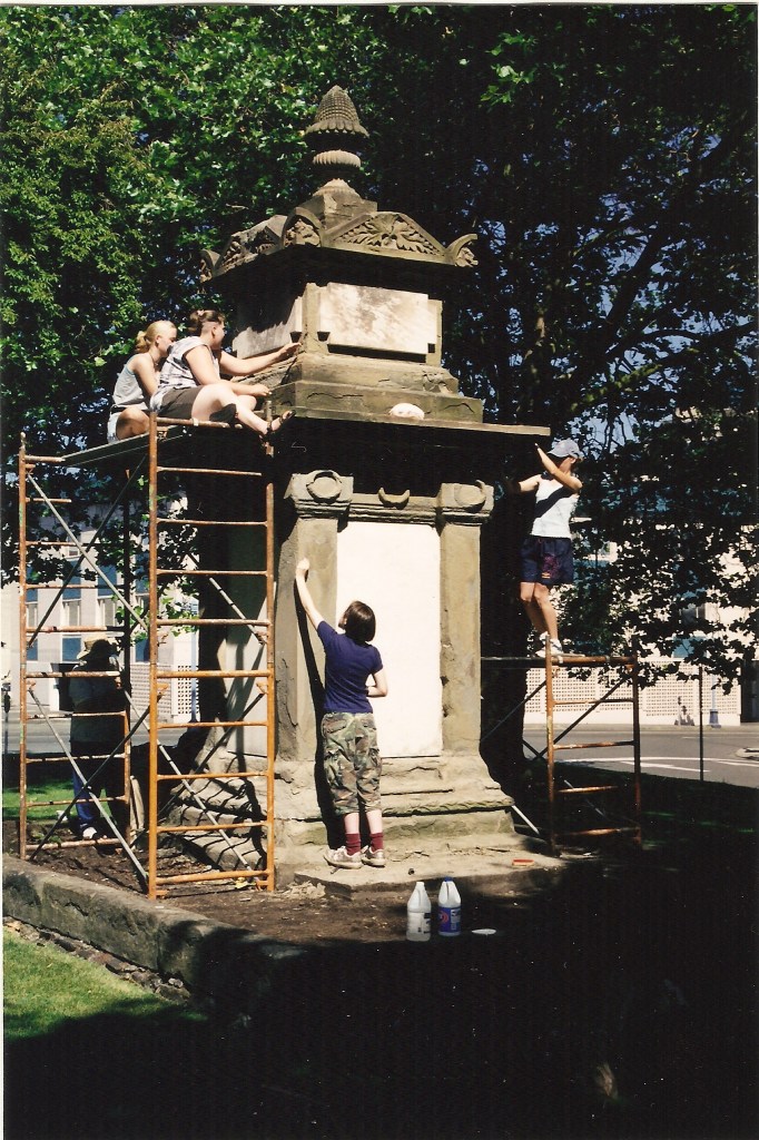 Conservation project on the Pritchard Tomb in the Old Burying Ground (Pioneer Square). It took three years and cost over $20,000. Moving some gravestones from the Old Burying Ground to safe storage and repairing markers and curbing that had been knocked over or damaged.