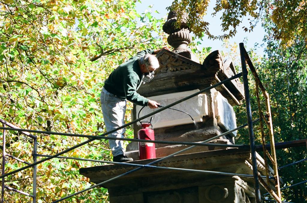 We are often asked how to clean gravestones. Many people, not knowing who to turn to, usually find themselves talking to a monument dealer. They may be very knowledgeable on what to do with granite headstones but their expertise, when it comes to historical markers made of sandstone or marble, is very limited. In fact, the information they may give you may permanently damage the stone. If it is a cleaning or if it is a repair, it may not last. They usually don’t have the specific training to answer these questions and would tackle the issues the same way they would for granite markers, with potentially disastrous results.