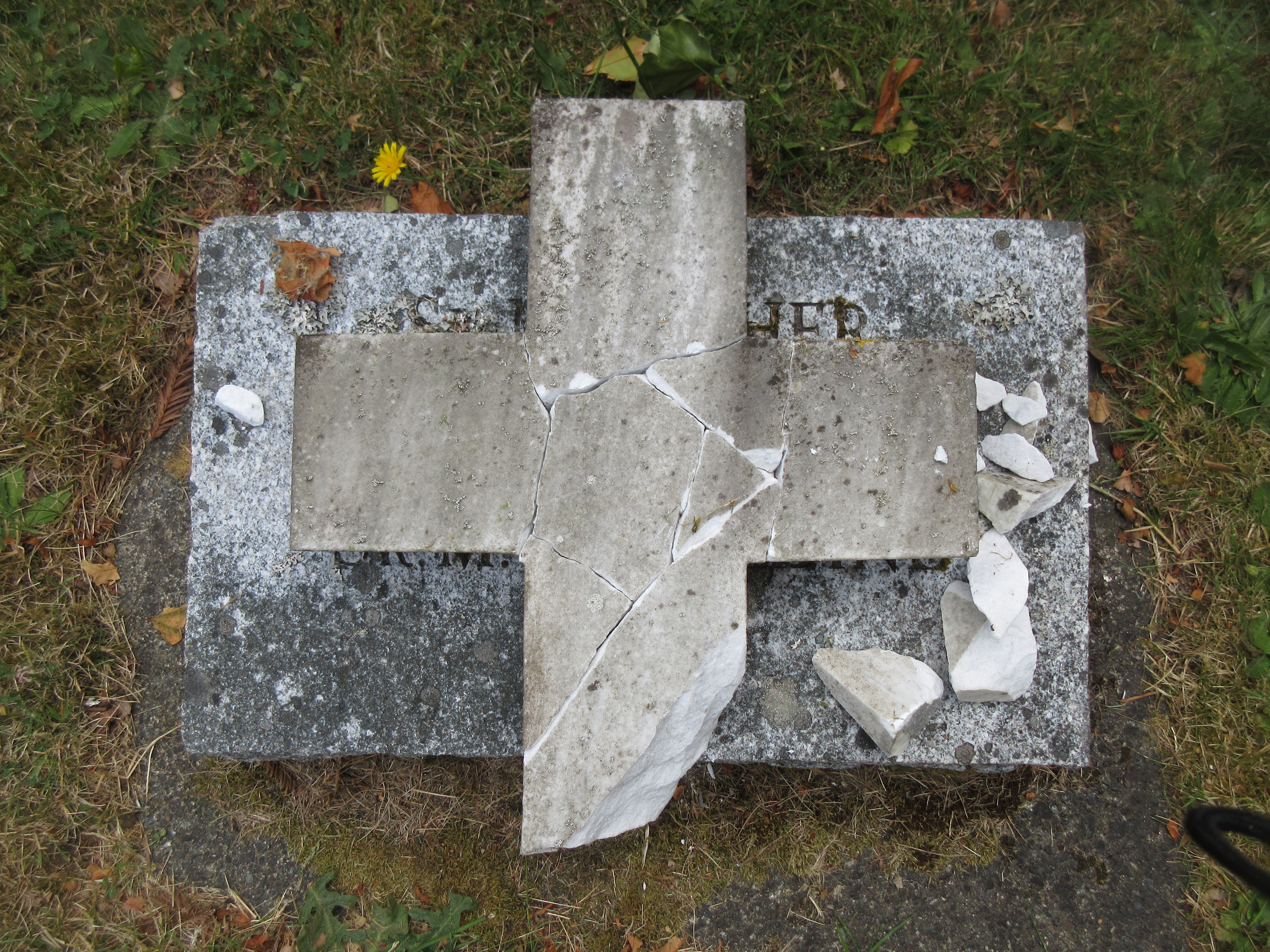 On checking with the City of Victoria, we were horrified to learn that City workers had identified 12 damaged markers in total in this one spate of destruction. Most were in Block U (the newer Catholic section), along the east side of the cemetery. Almost all involved grave markers with crosses — some were pushed over and others were smashed beyond repair. The City has filed a police report and notified the Catholic Diocese about the damage to graves within the two Catholic sections.