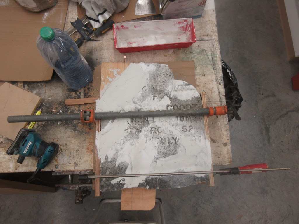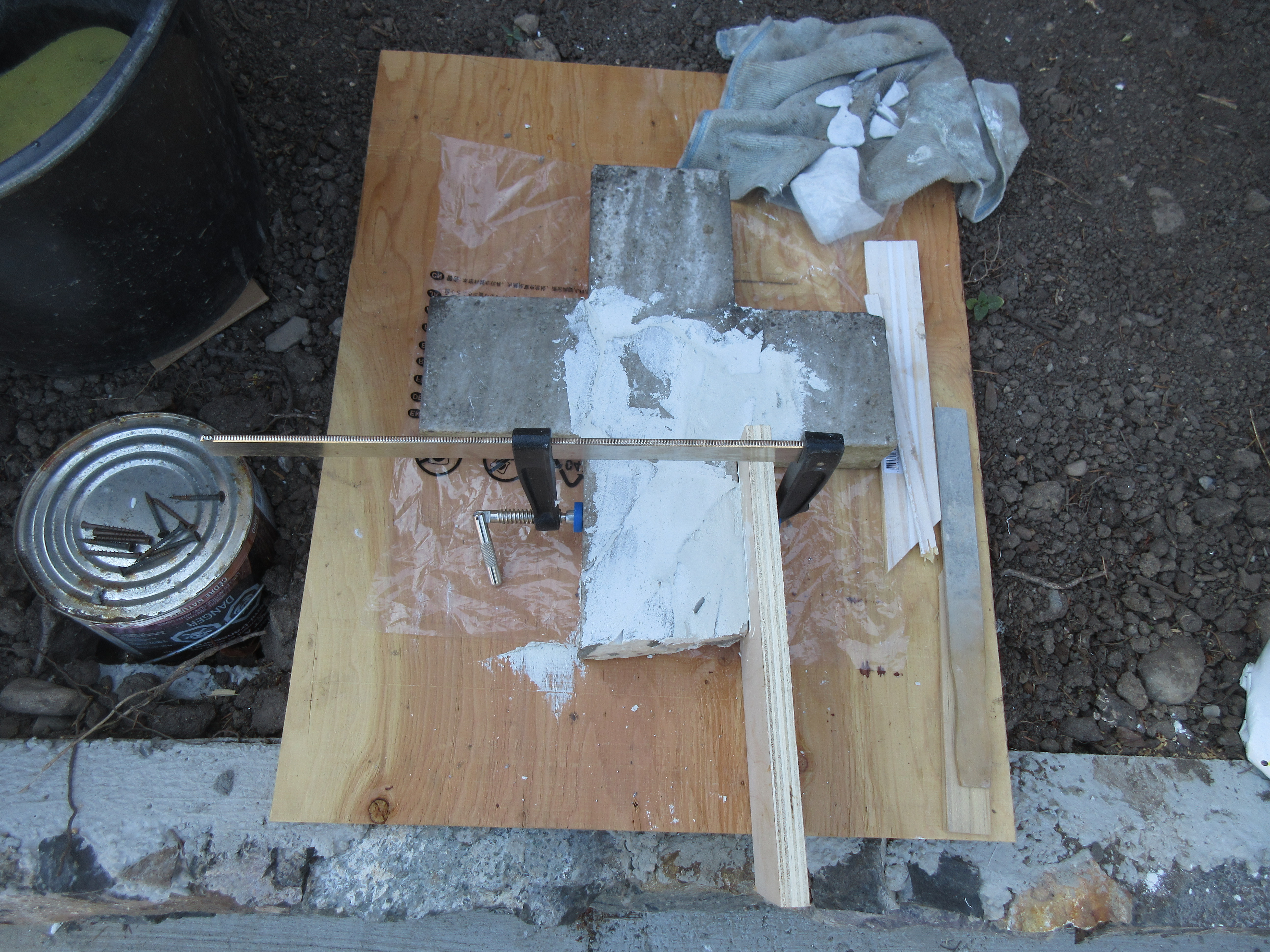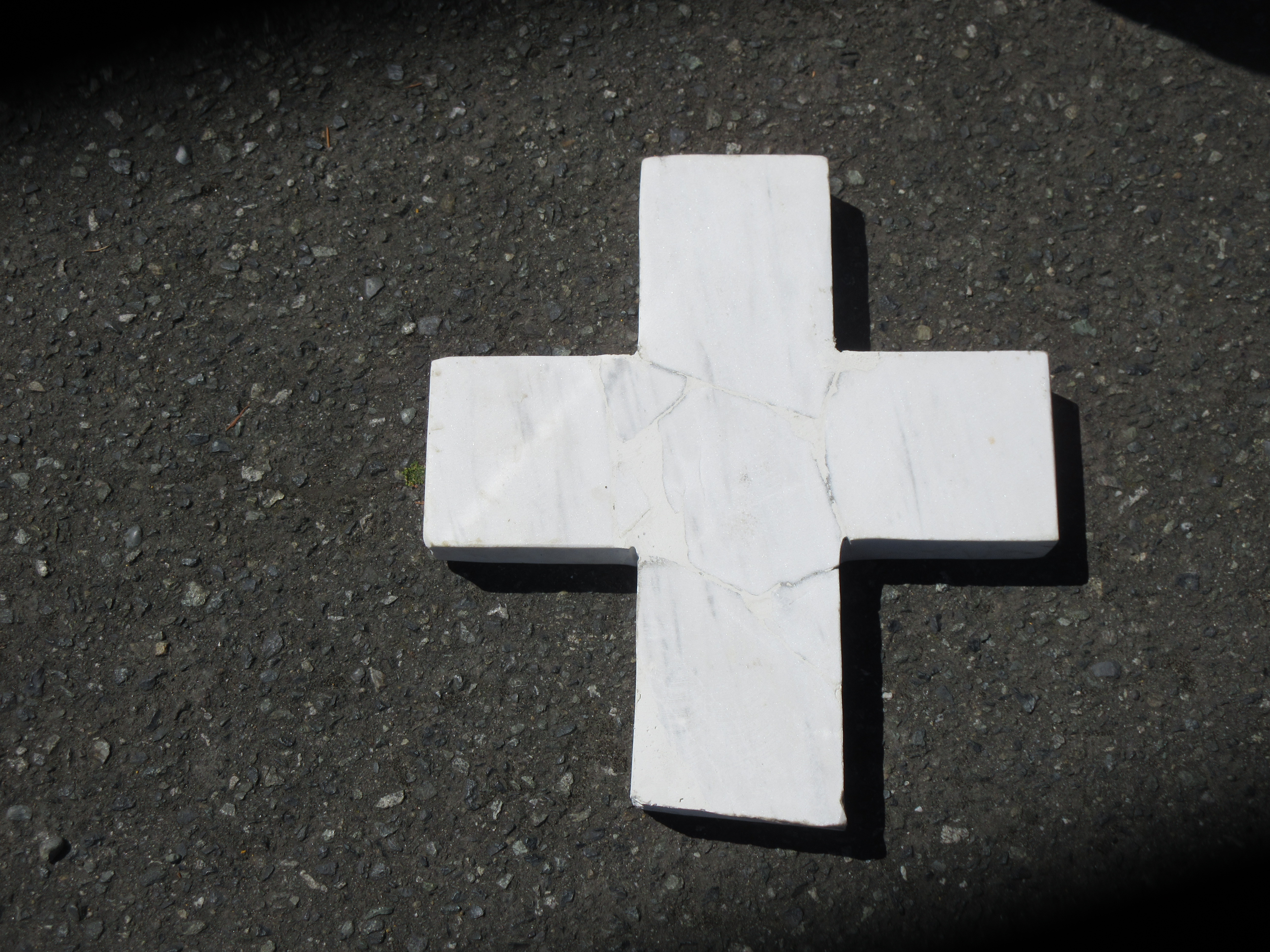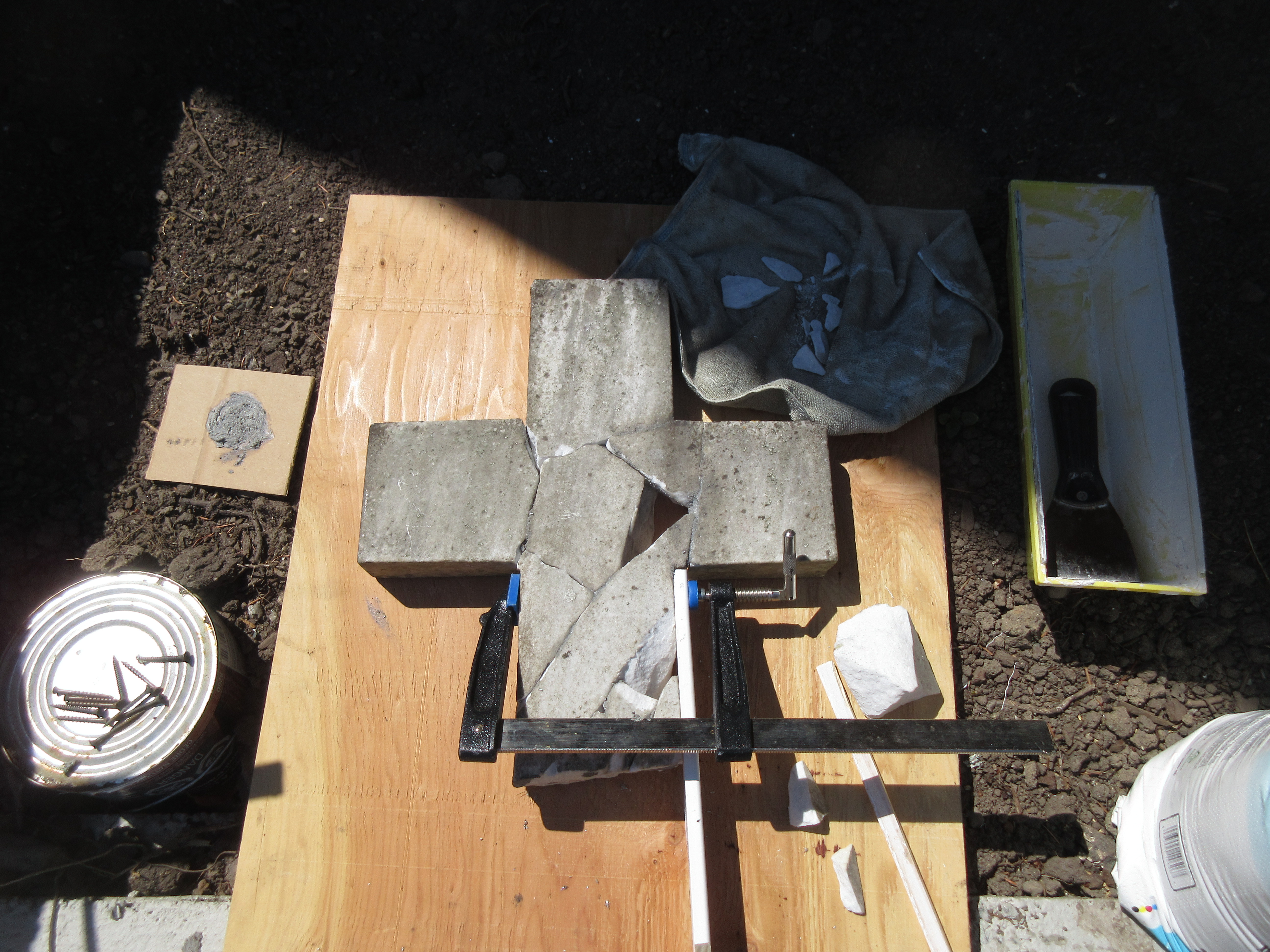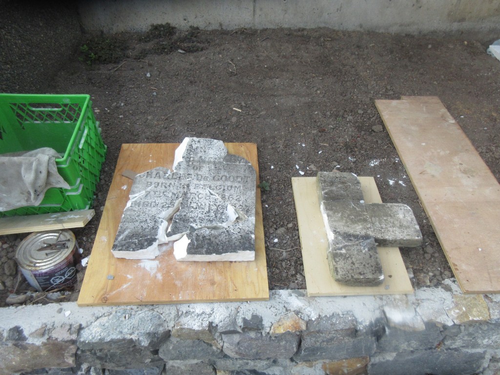 Attempting to repair a badly damaged marker. This one is now glued back together but will require lots of grout and tender love and care. But no matter how much love and care we give, it will never be the same! SAD.