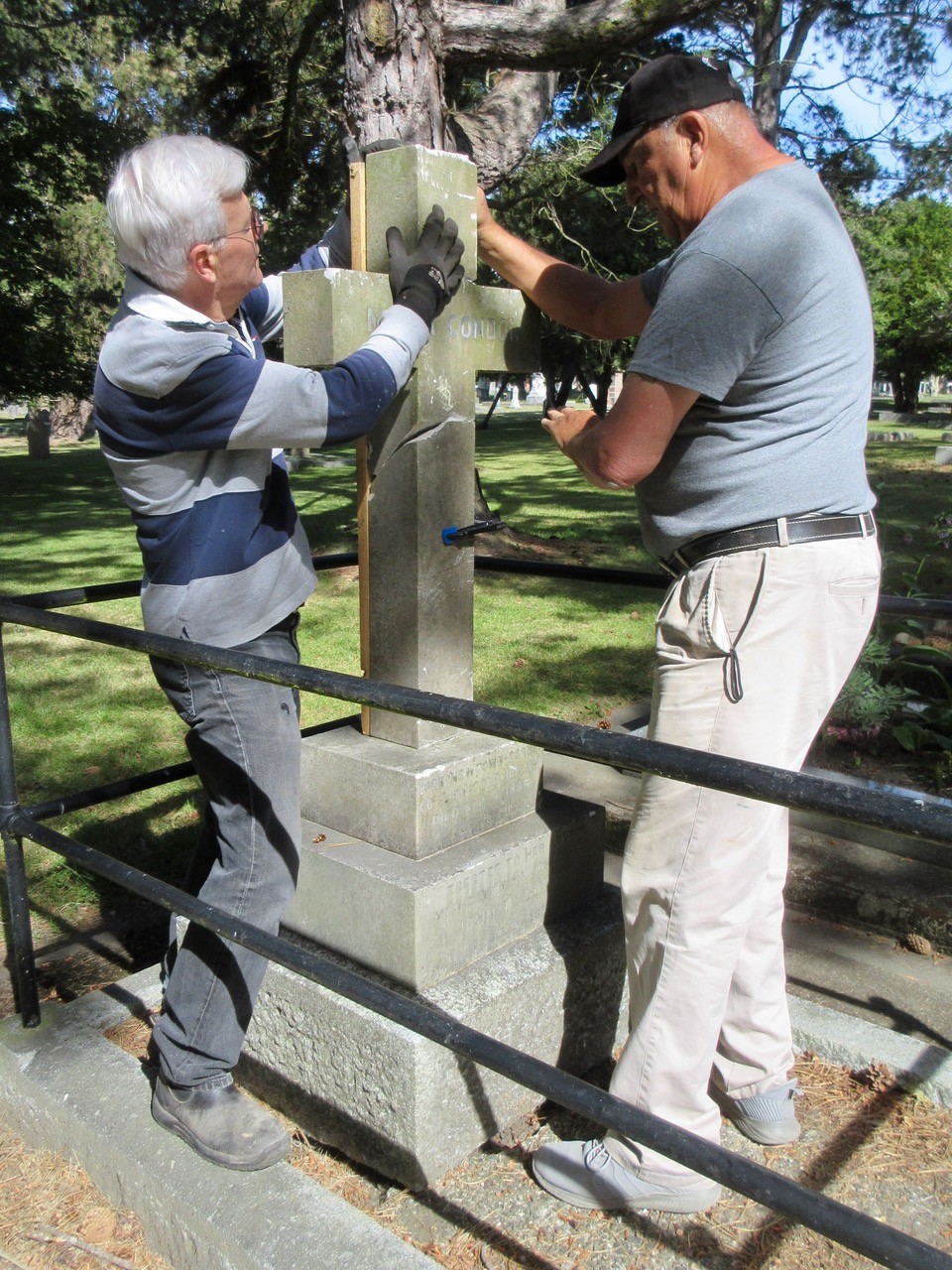 Our intrepid project manager Wilf Bruch has already surveyed the damage, and along with volunteer Gregory Ciupka and others, has begun the task of repairing what we can. In some cases, we may have to contract monument companies to do the work. Wilf will be talking with the City’s onsite supervisor this week about any help the City may be able to provide. Donations would be welcome to help with the cost of these repairs: via e-transfer to oldcemvictoria@gmail.com; cheque mailed to PO Box 50004, RPO Fairfield Plaza, Victoria BC V8S 5L8; or cash dropped off at any of our tours.