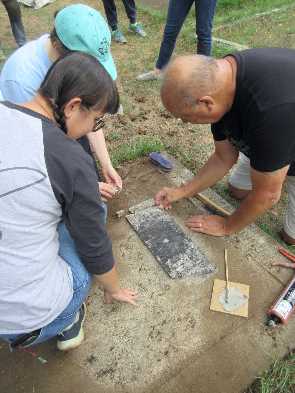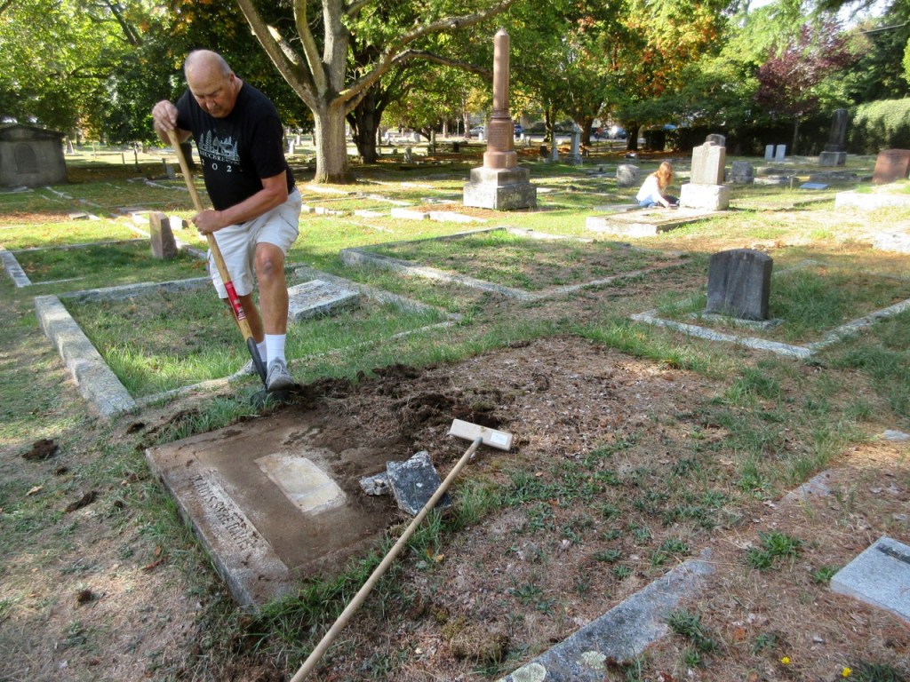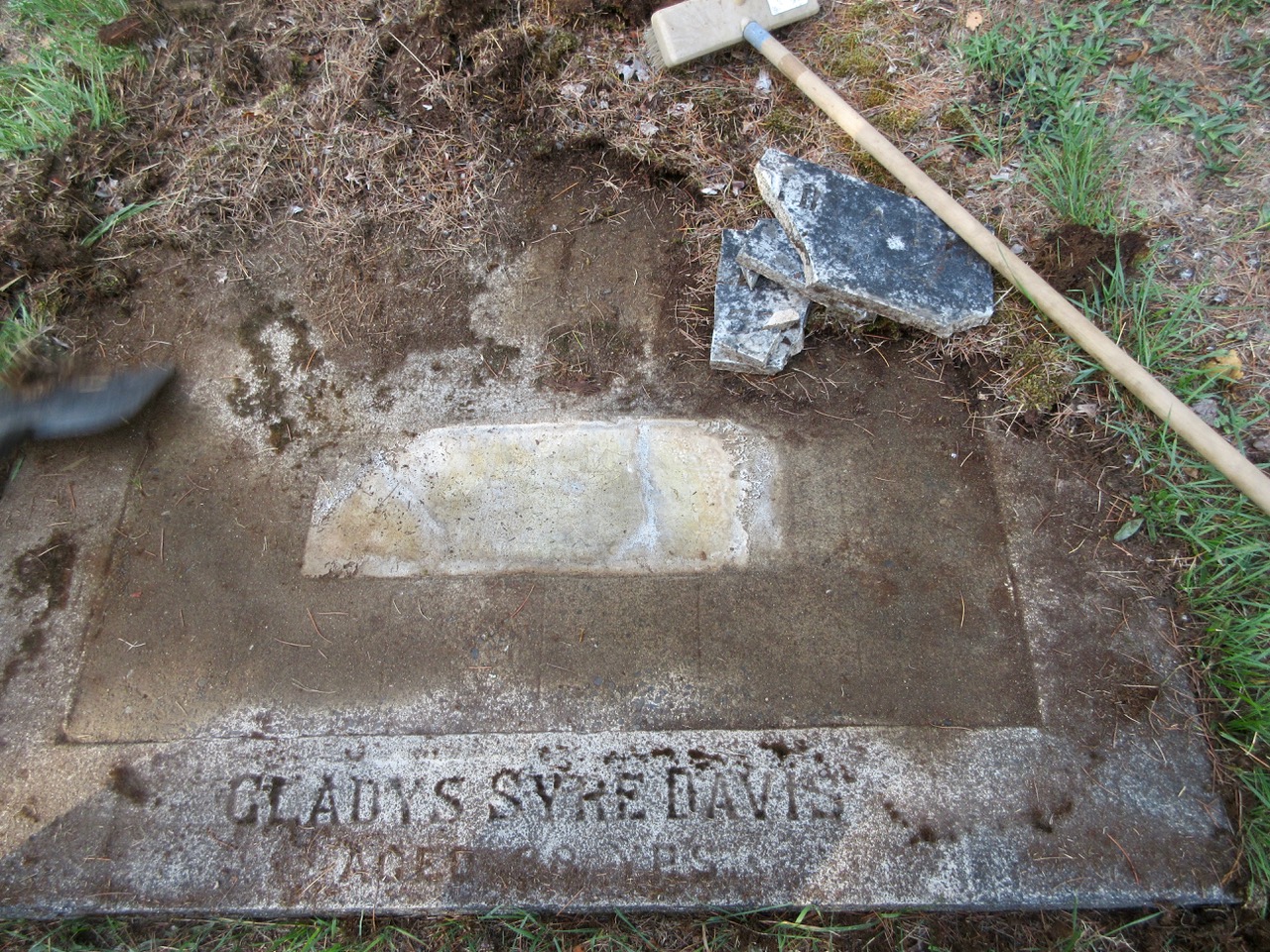 Our cleaning bees aren’t always about water, soap and brushes. When we choose an area to clean, we never know what we will find. Our last bee on September 27th brought us to the grave of Gladys Davis (P110WR). This grave was in sad shape, overgrown and covered by a thick mat of moss. On starting to remove the moss, we found the the marble plaque had fractured in many pieces and only still there by the grace of the thick moss.