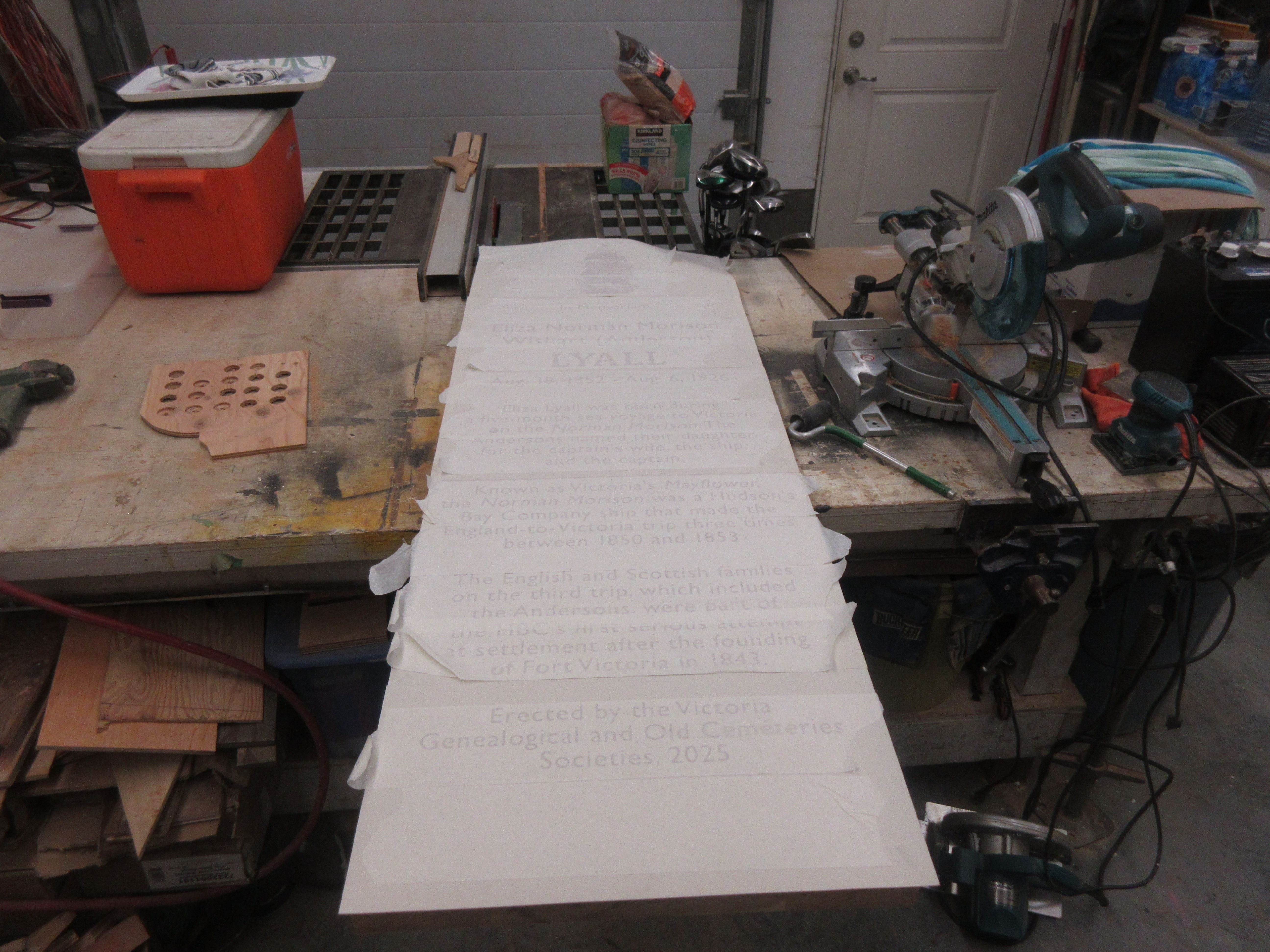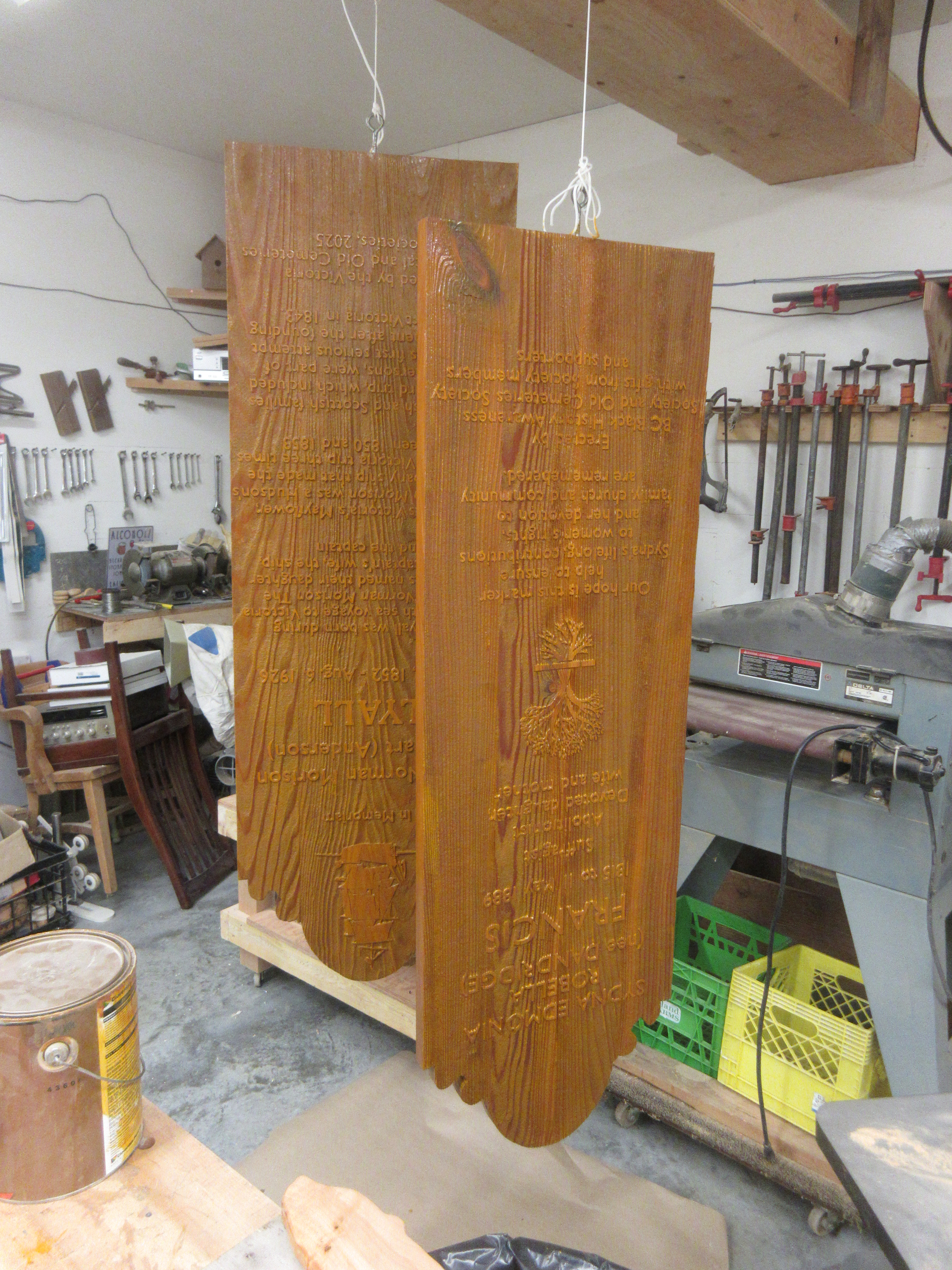 The new grave markers are made from local cedar, sandblasted to give them a sign-like appearance and finished with white painted lettering. We started off with 2X6 cedar planks. These were glued together to form a 24-inch by 6-foot blank. After much sanding and planing, a decorative scroll was cut into the top. Now ready for finishing, the sandblasting matts were ordered for Mortimer’s Monumental Works, applied to the blanks’ surfaces and taken to Blast It Sandblasting Victoria for sandblasting. Once sandblasted, the matt material was removed; the total surface was given two coats of preservative and allowed to dry for two weeks to ensure a good cure. Then the lettering was painted white and the finished grave markers were erected on their respective grave sites at Ross Bay Cemetery.