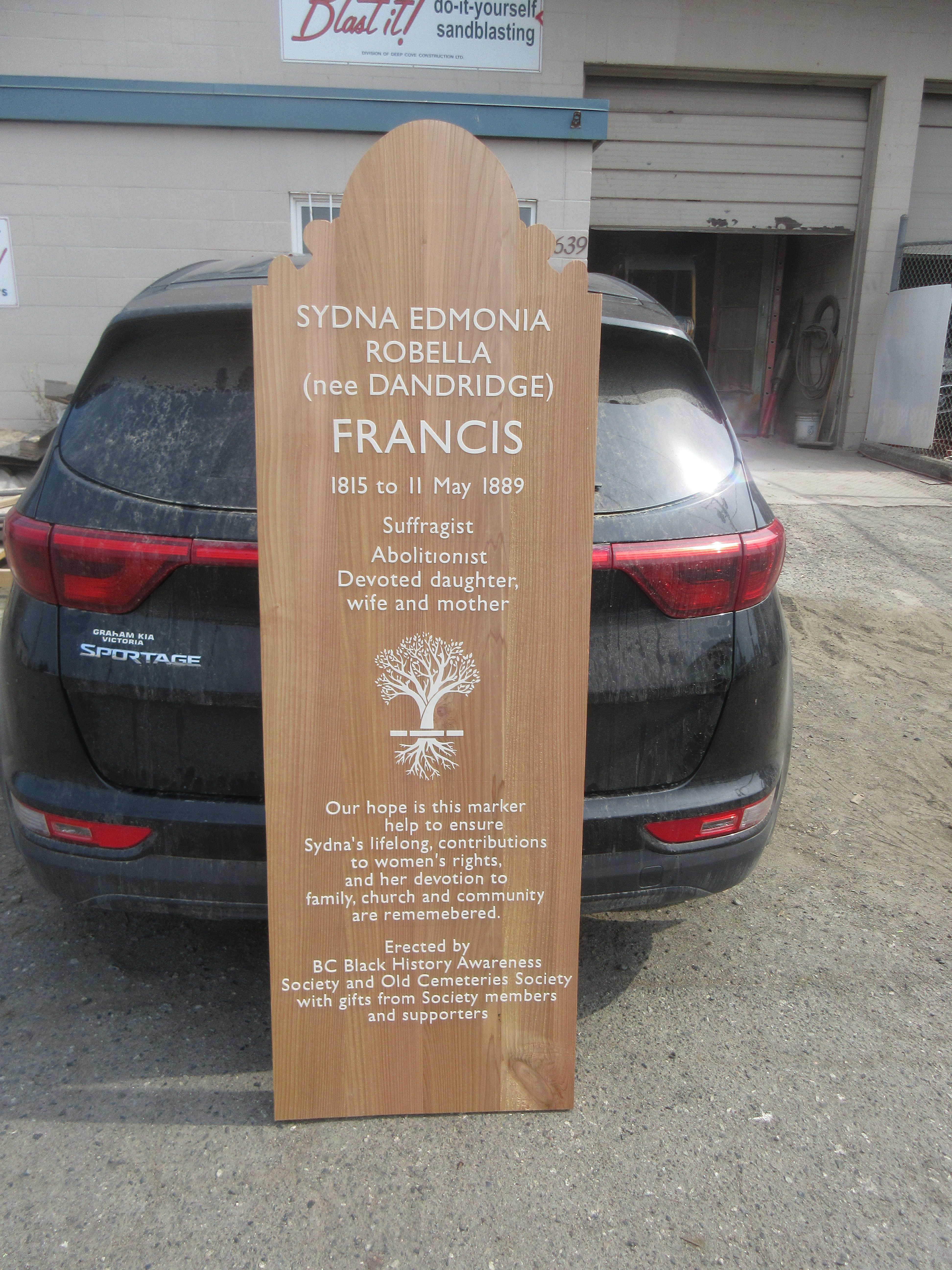 The BC Black History Awareness Society chose Sydna Edmonia Robella (nee Dandridge) Francis. She was a Black pioneer, suffragist and abolitionist.