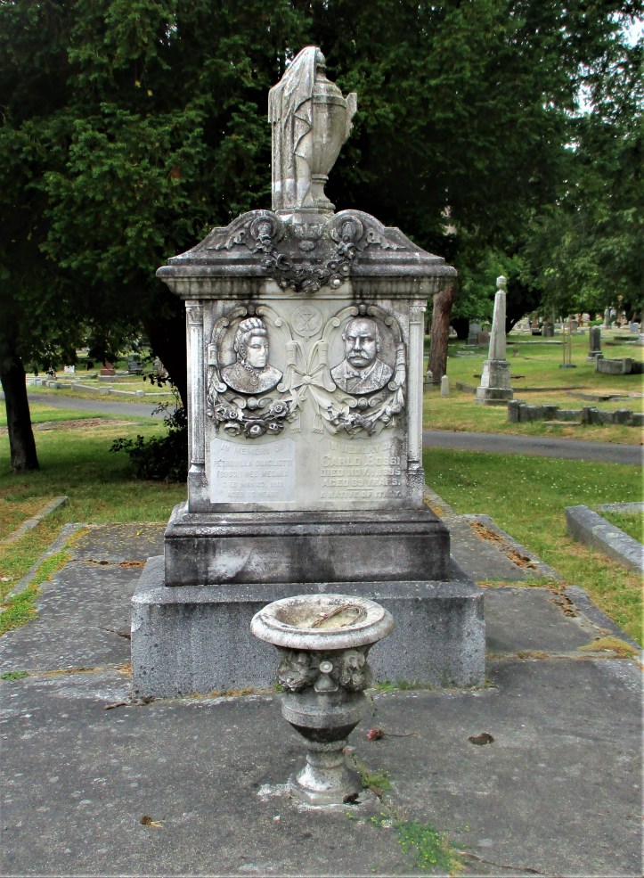When Carlo Bossi died his wife, Petronella, designed his tombstone. She asked an Italian sculptor originally from the same village as her husband to carve it. It features portraits of Carlo and Petronella and has much floral symbolism. Bossi was a prominent member of the Pioneer Society as its symbol is carved between the two portraits.